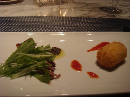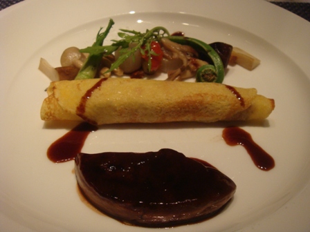 下段真ん中の写真は、鴨肉のクレープ包みとフォアグラ