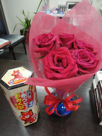 福島のSさんからは素敵な真っ赤なバラの花束と、赤べこのお菓子をいただきました